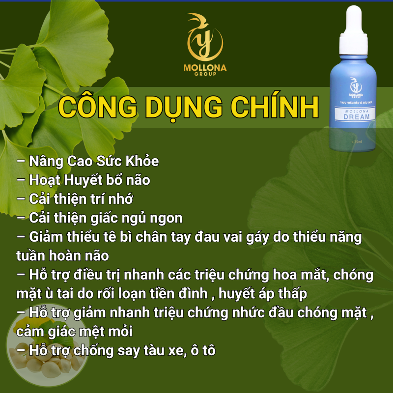 - Nâng Cao Sức Khoẻ - Hoạt Huyết bổ não - Cải thiện trí nhớ - Cải thiện giấc ngủ ngon - Giảm thiểu tê bì chân tay đau vai gáy do thiểu năng tuần hoàn não - Hỗ trợ điều trị nhanh các triệu chứng hoa mắt , chóng mặt ù tai do rối loạn tiền đình , huyết áp thấp - Hỗ trợ giảm nhanh triệu chứng nhức đầu chóng mặt , cảm giác mệt mỏi - Hỗ trợ chống say tàu xe , ô tô
